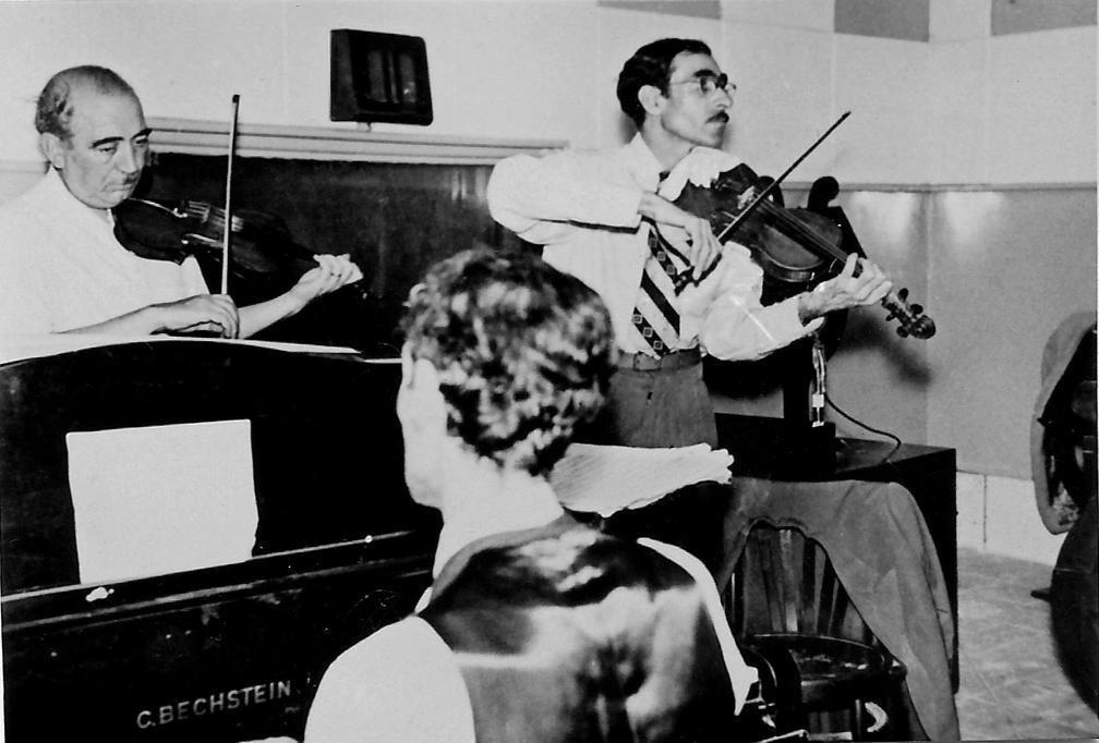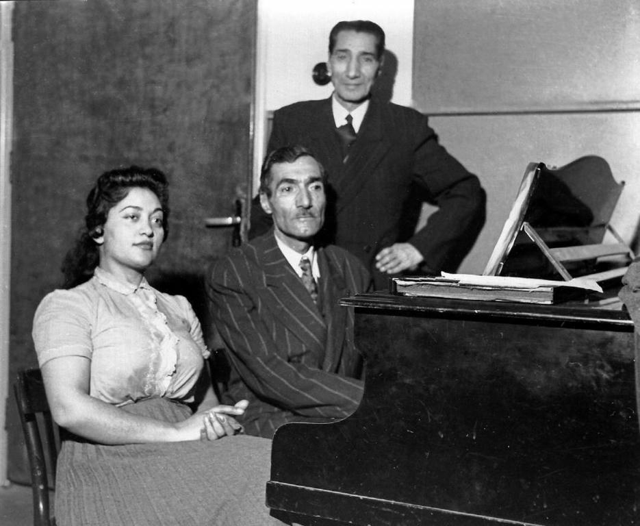 ابوالحسن صبا، مرتضی محجوبی و علی تجویدی در ایستگاه رادیو واقع در میدان ارگ در سال 1334