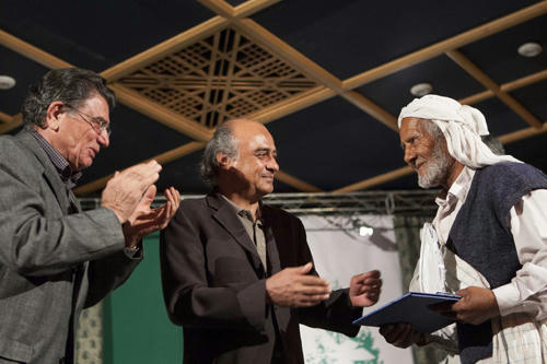زنده یاد غلامحسین سمندری که به نمایندگی ازایشان پسرایشان حسن سمندری تندیس ایشان رادریافت کرد